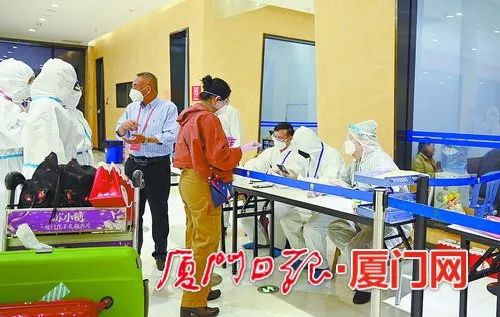 測溫、溝通、登記、分流……凌晨3點,機場大巴駛入廈門機場入境人員分流服務中心,大廳里一片繁忙。在工作人員的引導下,旅客按照指示牌,前往不同的登記處錄入信息、或入住、或搭各市、區(qū)政府專車去往目的地。
