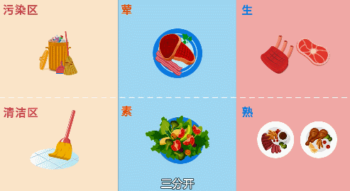 即污染區(qū)與清潔區(qū)分開、葷素食品分開洗切、生熟食品分開存放。