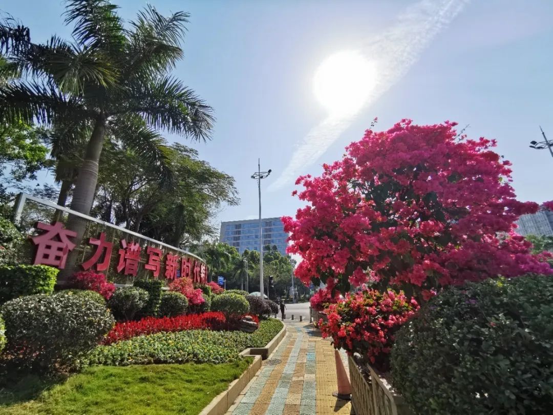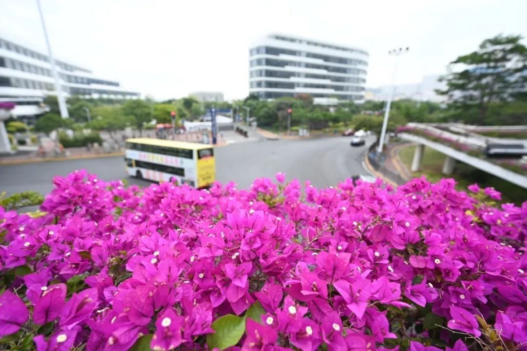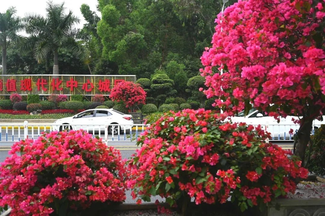 在枋湖南路、枋湖路、金湖路等重要道路,各色三角梅采用立體花柱、花盆等形式,配以皇帝菊、黃穗冠點綴,為城區(qū)染上繽紛色彩。