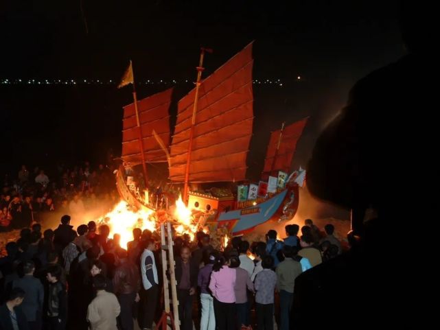 當(dāng)晚,大家開(kāi)始一起上香祭拜,點(diǎn)火、跪拜,眾人隨著火勢(shì)喊著“順風(fēng)”“發(fā)啊”,王船在火焰中慢慢燒化,一直跪拜到船的主桅桿倒下才離開(kāi)整個(gè)送王船的儀式才算完成。