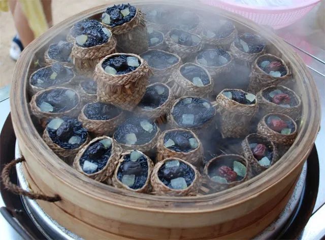 烏米飯為農(nóng)歷三月三食用,將烏稔樹葉子舂碎后貯入布袋,連袋放到鐵鑊中熬湯,而后去掉葉渣,將糯米泡進(jìn)湯汁里,幾小時(shí)后,撈起放到木甑里蒸熟。