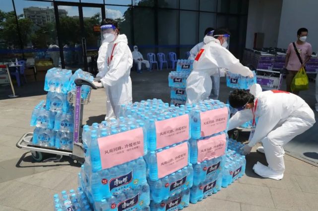 身穿防護(hù)服的工作人員接過(guò)愛(ài)心礦泉水