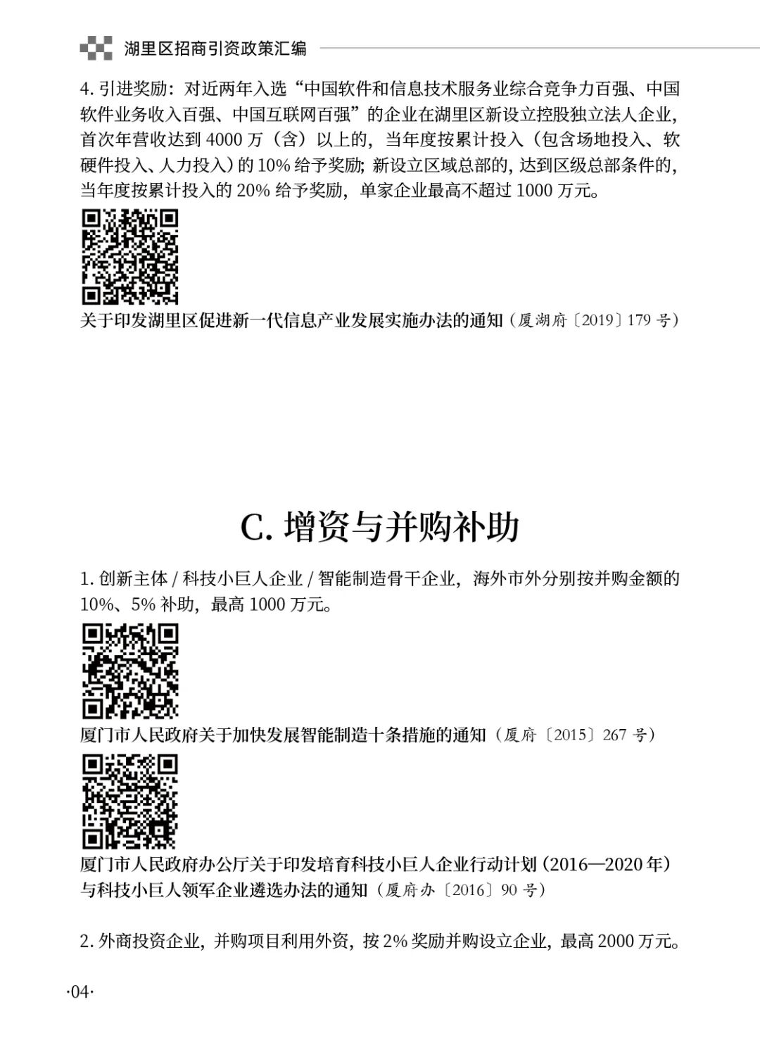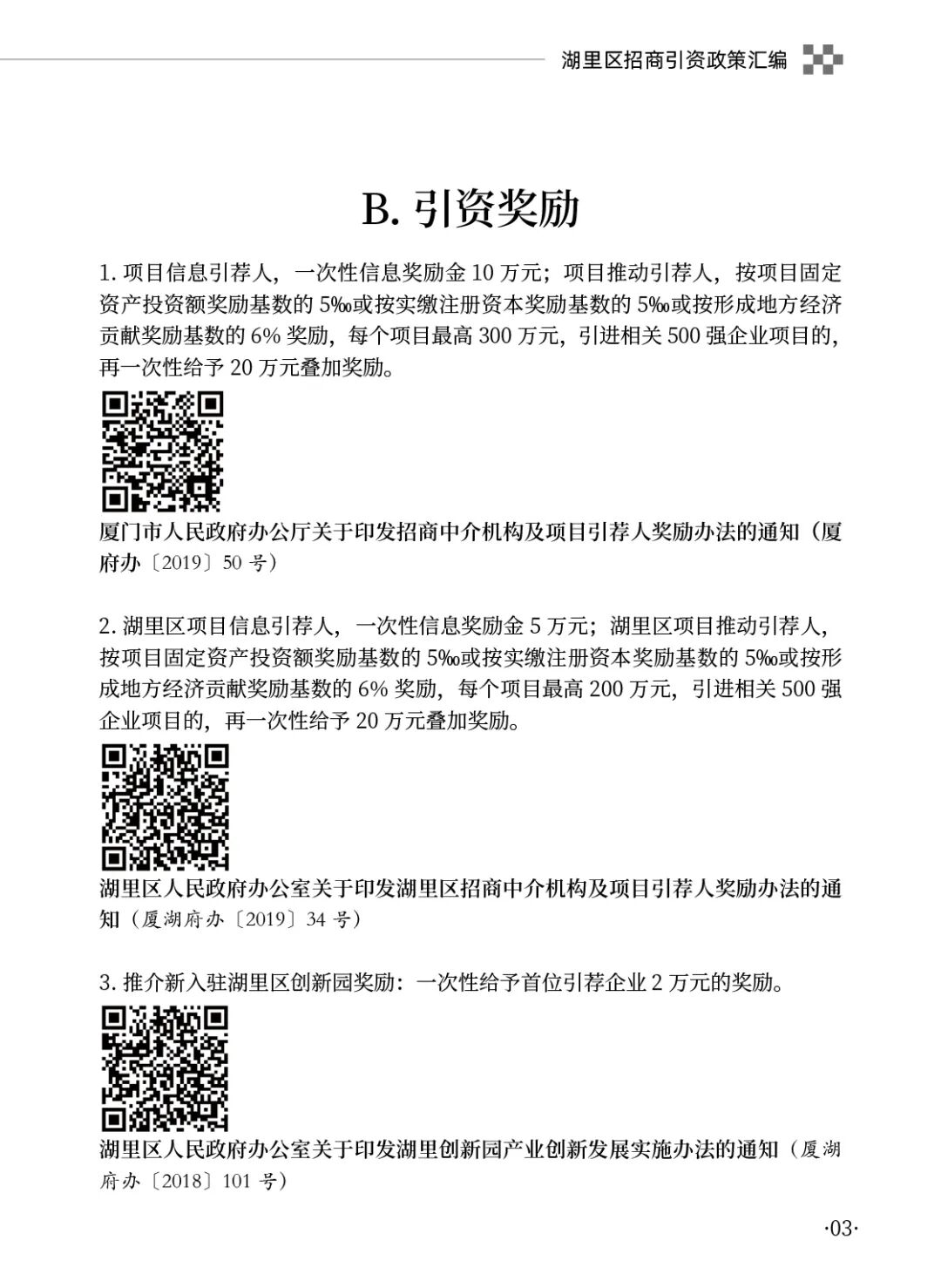 在湖里區(qū)有關(guān)部門的支持配合下,湖里區(qū)商務(wù)局重新組織編印了《湖里區(qū)招商引資政策匯編(2020二維碼版)》,近期將向有需求企業(yè)配送,歡迎大家掃碼使用。