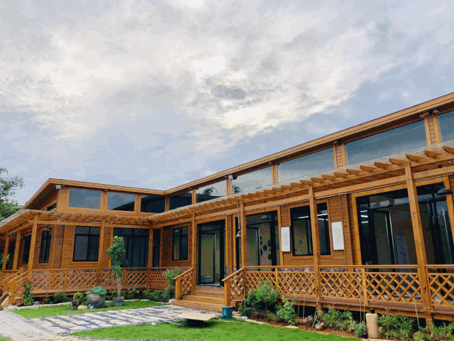 走進蒙養(yǎng)時光,這里依山傍水而建,行走在石頭路上,木屋的墻上,小鄒夫妻將版畫作品鑲嵌其中,四周種滿綠植果樹,愈加增添文藝、寧靜的氣息。