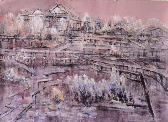 水彩畫《印象·五緣灣之四》林立的高樓,蜿蜒的木棧道,錯(cuò)落有致的景觀,從物象的再現(xiàn),到意象的表現(xiàn),以及抽象因素的構(gòu)成,無不凸顯出作品大風(fēng)景大氣魄,展現(xiàn)了新時(shí)代新氣象,給人欣欣向榮、祥和美的精神享受。