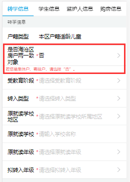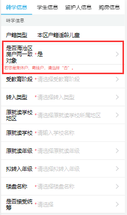 本區(qū)戶籍適齡兒童請(qǐng)先選擇“是否海滄區(qū)房戶兩一致對(duì)象”(若您是集體戶、寄掛戶,請(qǐng)選擇“否”)才會(huì)跳轉(zhuǎn)出轉(zhuǎn)學(xué)信息: