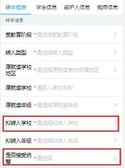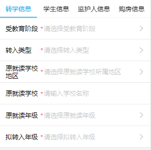 轉(zhuǎn)學(xué)信息須填寫:受教育階段(小學(xué)或初中)、轉(zhuǎn)入類型、原就讀學(xué)校地區(qū)、原就讀學(xué)校、原就讀年級(jí)、擬轉(zhuǎn)入年級(jí)和是否接受統(tǒng)籌等信息。