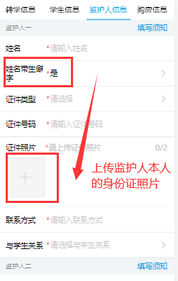 如果監(jiān)護(hù)人姓名帶生僻字,則“姓名帶生僻字”選擇“是”,須上傳本人身份證照片。