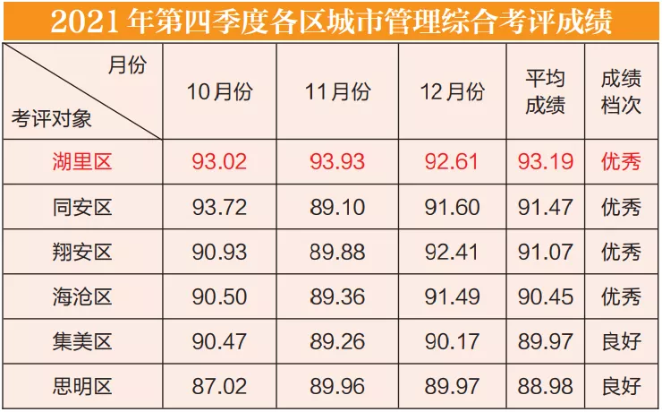 近日,市城市綜合管理考評(píng)委發(fā)布《2021年第四季度廈門市城市管理綜合考評(píng)成績(jī)通報(bào)》,湖里區(qū)在全市各區(qū)中排名第一,全年總評(píng)第一。