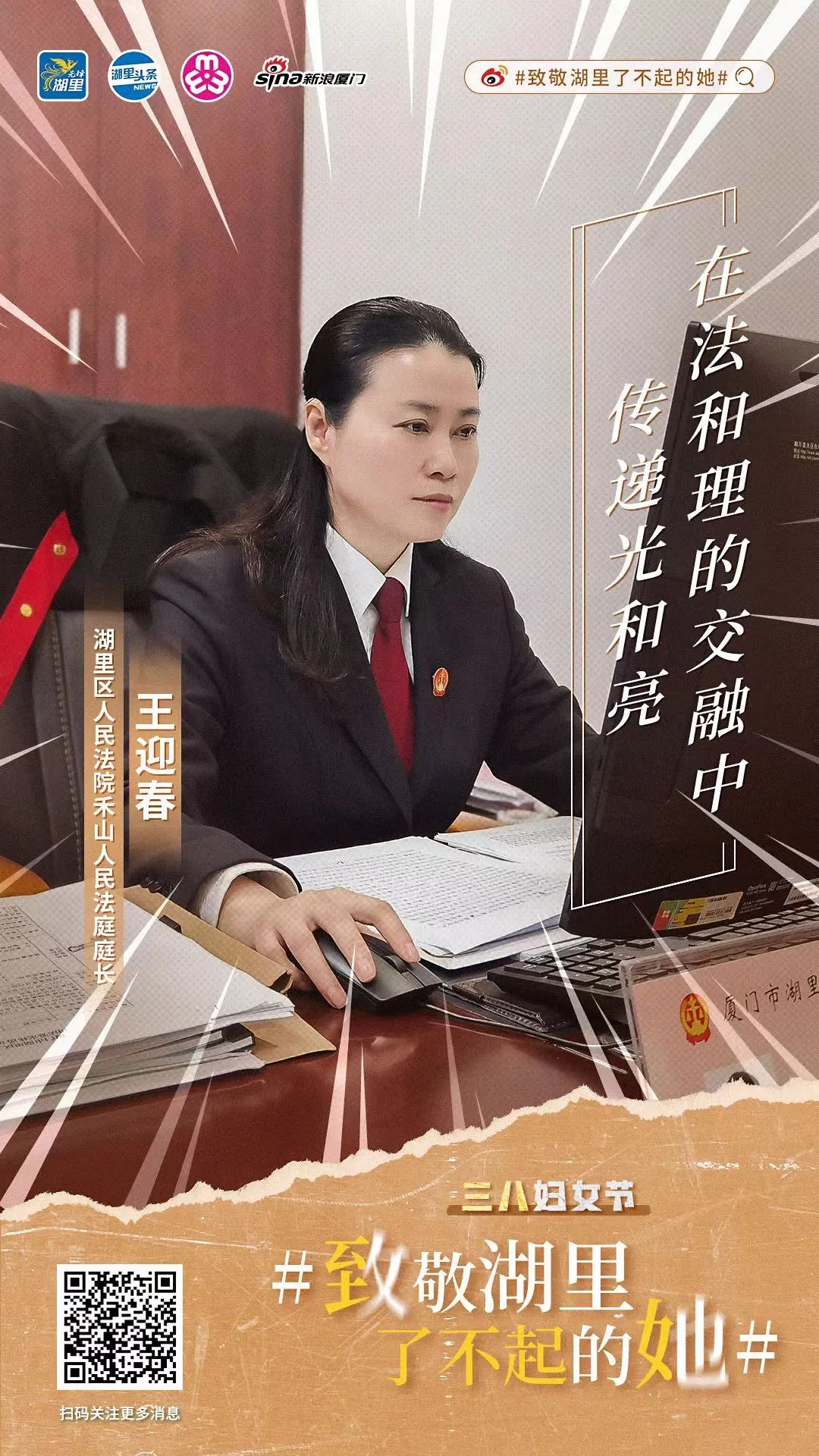 自1995年進入法院后,二十多年來王迎春一直在基層法院民事審判第一線工作,審理的民事案件超5000件。她堅持細致慎重、快捷高效的辦案原則,將德、情、理、法融于家事審判工作中,注重調(diào)解,妥善化解各種矛盾,確保法律效果和社會效果的協(xié)調(diào)統(tǒng)一。在她的帶領(lǐng)下,2021年12月禾山法庭獲評全國維護婦女兒童權(quán)益先進集體。