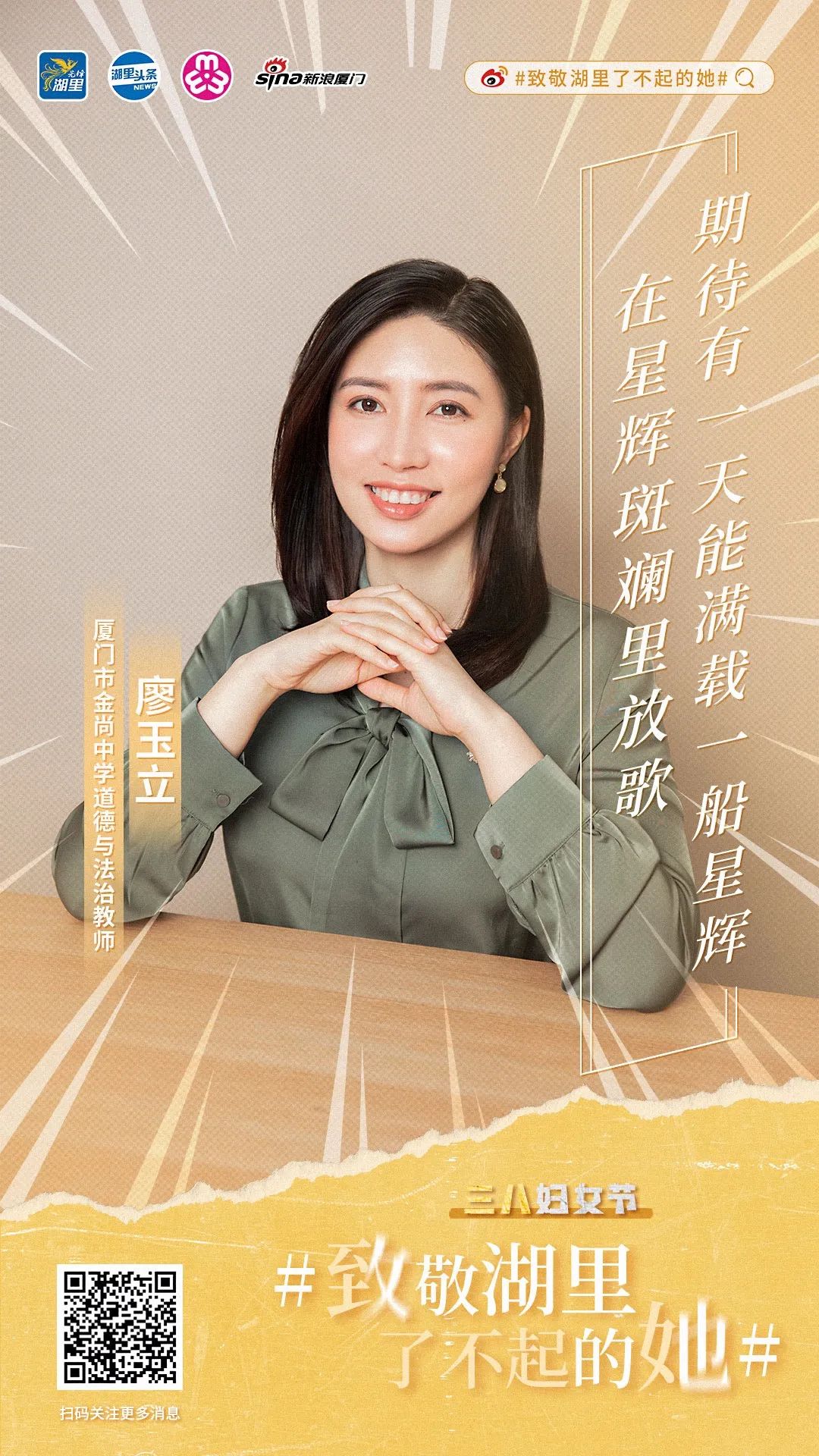 秉承“學高為師,身正乃范”的良訓,廖玉立身為班主任,用心育人,多次獲“區(qū)優(yōu)秀班級”“校文明班級”等榮譽稱號。身為一級教師,她在學科教學上,求實創(chuàng)新,善于反思。多次開展省市區(qū)級公開課及講座,多篇教育教學論文發(fā)表于CN級刊物。作為廈門市及湖里區(qū)的黨史理論宣講員,積極進學校、進社區(qū)、進基層宣講黨史,發(fā)揮輻射作用,引導傳承紅色基因。疫情期間,她作為福建教育名師線上開展援疆送培活動、省名師課堂、作為區(qū)教師代表執(zhí)教區(qū)開展復學第一課。