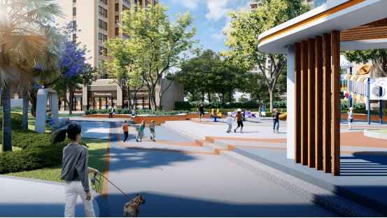 設(shè)計理念:以“橙.趣”為主題構(gòu)思,以一抹流動的活力橙激活社區(qū)公共空間,組織交通,貫穿全園,打開原本封閉的空間關(guān)系,以休閑活動為主要功能,同時增設(shè)兒童活動場地,滿足居民需求,使得整個場地?zé)òl(fā)新的活力。