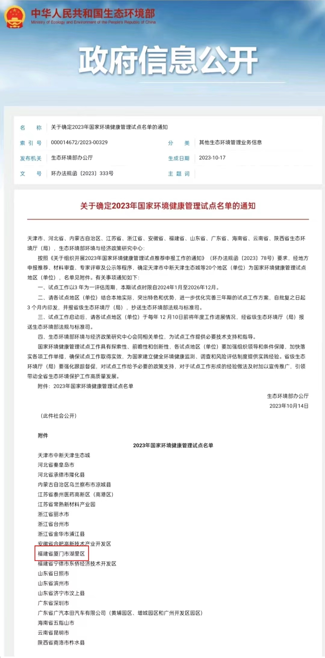 近日,生態(tài)環(huán)境部發(fā)布《關(guān)于確定2023年國(guó)家環(huán)境健康管理試點(diǎn)名單的通知》(環(huán)辦法規(guī)函[2023]333號(hào)),經(jīng)組織申報(bào)、現(xiàn)場(chǎng)答辯、專家評(píng)審,正式將廈門市湖里區(qū)等20個(gè)地區(qū)(單位)確定為國(guó)家環(huán)境健康管理試點(diǎn)地區(qū)(單位)。