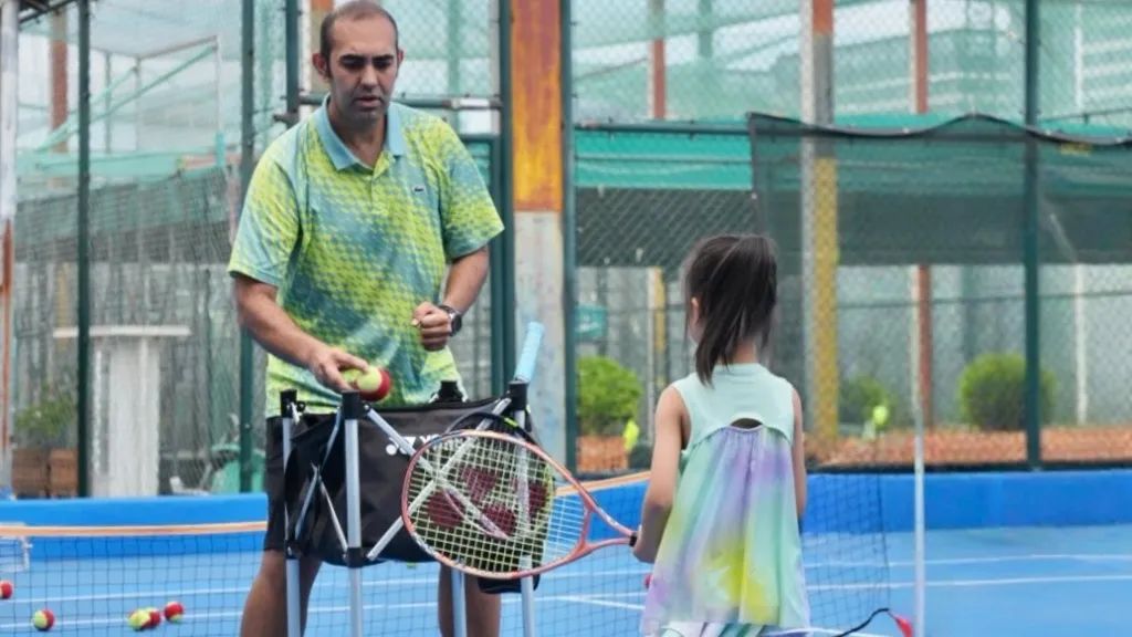 8月22日,來自伊朗的網(wǎng)球教練馬季(Majid)在奧林匹克諾斯蒂文化體育公園指導(dǎo)一名小朋友打球。(澎湃新聞記者 王岱玉 圖)