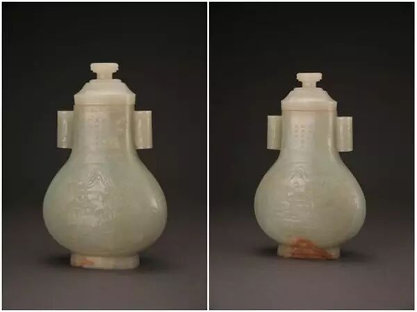白玉御題薄意山水帶蓋貫耳扁瓶
