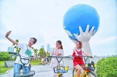 9月2日,游客在廈門環(huán)島路旁的雕塑前合影。光明日報記者 周官正攝/光明圖片