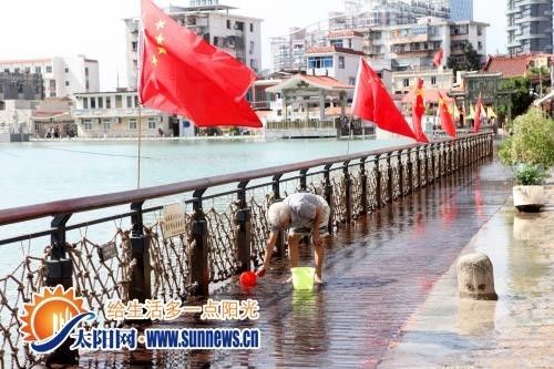 在地勢(shì)較低的沙坡尾,海水一度淹沒了避風(fēng)塢里的木棧道。不過,記者在現(xiàn)場(chǎng)看到,眼看海水就要淹到腳邊了,來這拍婚紗照的新人們?nèi)岳^續(xù)在鏡頭前擺著各種姿勢(shì);本地居民則已見怪不怪,還借著近在咫尺的海水沖洗一下門口的青石路面;外地游客則非常開心,不少人脫了鞋光腳踩進(jìn)木棧道上的海水里,并拍照留念。