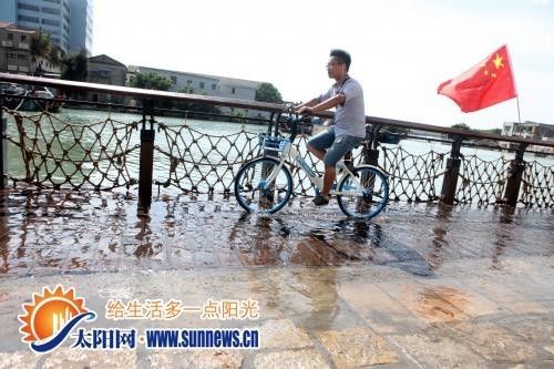 根據(jù)廈門海洋預(yù)報(bào)臺(tái)的觀測(cè),當(dāng)日的最高潮位大約為700厘米(相對(duì)廈門零點(diǎn)潮位的高度),剛好達(dá)到廈門的藍(lán)色警戒水位。在最高潮位時(shí),海平面已經(jīng)離演武大橋外側(cè)觀景平臺(tái)的底部很近了,市民不用探出頭就能看到近旁的海面;遠(yuǎn)眺對(duì)面的鼓浪嶼,幾乎已經(jīng)看不清黃色的沙灘。