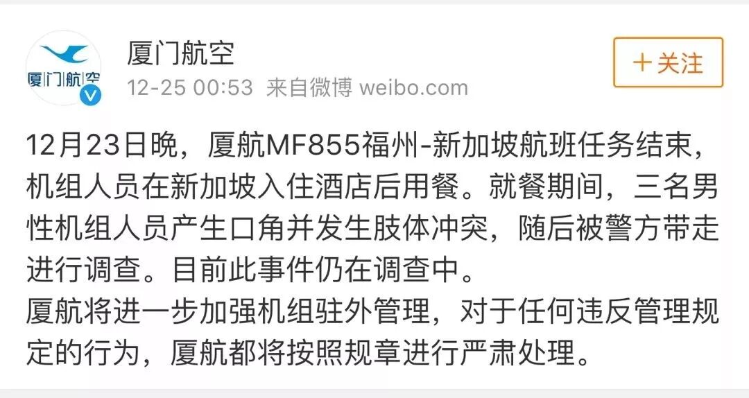 中新網(wǎng)12月25日電 廈門航空官方微博今日凌晨通報(bào)稱,12月23日晩,廈航MF855福州-新加坡航班任務(wù)結(jié)束,機(jī)組人員在新加坡入住酒店后用餐。就餐期間,三名男性機(jī)組人員產(chǎn)生口角并發(fā)生肢體沖突,隨后被警方帶走進(jìn)行調(diào)查。目前此事件仍在調(diào)查中。 廈門航空表示,廈航將進(jìn)一步加強(qiáng)機(jī)組駐外管理,對于任何違反管理規(guī)定的行為,廈航都將按照規(guī)章進(jìn)行嚴(yán)肅處理。 (原標(biāo)題...