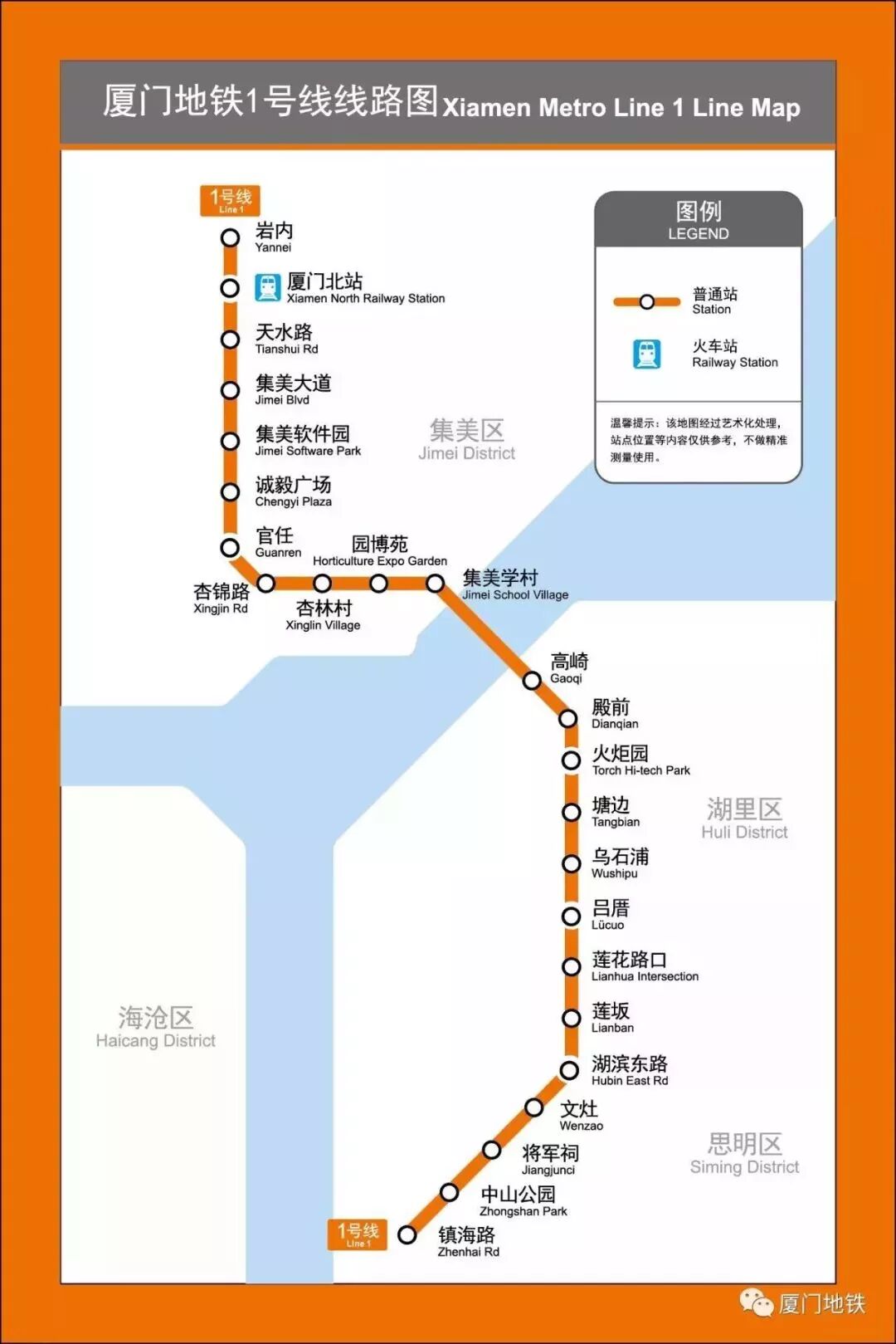 地鐵1號(hào)線,銜接新老城區(qū),服務(wù)通勤客流,全長(zhǎng)30.3公里,共設(shè)24個(gè)站點(diǎn)。起點(diǎn)在鎮(zhèn)海路站,途經(jīng)文園路、嘉禾路出島;在高集海堤、集杏海堤探出地面,以高架和地面方式跨海;過(guò)海后又重新鉆入地下,沿杏錦路、集美大道,最終到達(dá)終點(diǎn)巖內(nèi)站,全程30.3公里。