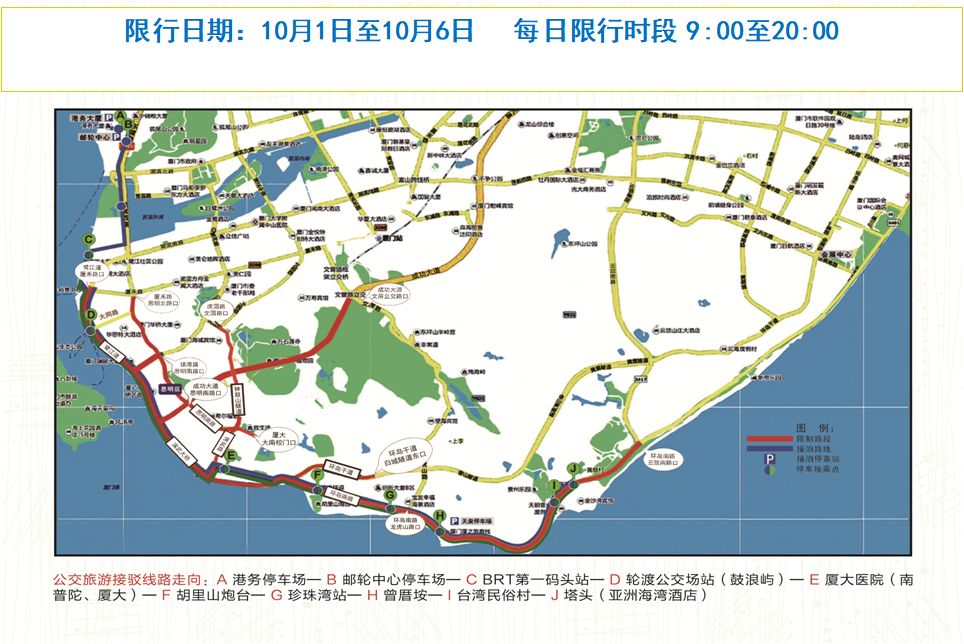 2、2018年10月1日至10月6日,思明區(qū)思明南路演武西路口至廈門大學大南校門路段禁止旅游客車駛?cè)?/span>,需要上下客車輛允許在成功大道演武立交下方道路兩側(cè)臨時???。該路段其他機動車仍按《廈門市公安交通管理局關(guān)于在思明區(qū)思明南路演武西路口至廈門大學大南校門路段采取機動車道路交通限制措施的通告》(廈公交管通〔2016〕24號)限制駛?cè)搿?span>暨每日9時至17時只允許公交車、出租車進出,出租車維持8分鐘限時通行措施,其他車輛禁止駛?cè)耄◤B大校內(nèi)車輛除外,但仍需受單雙號限制)。