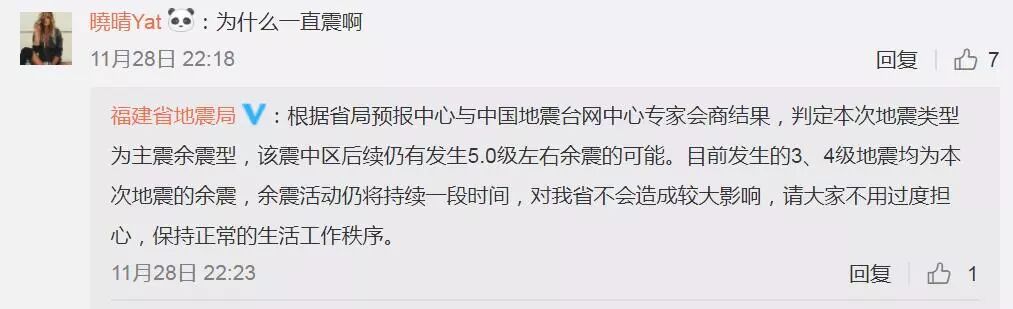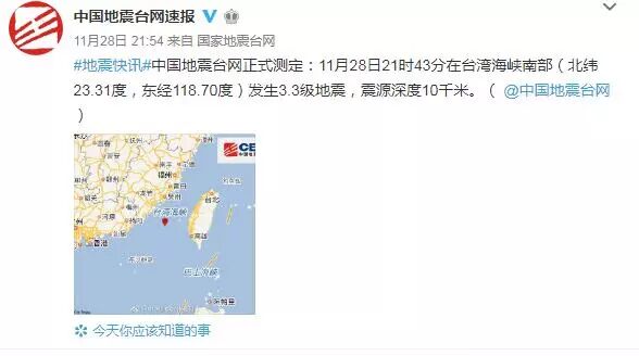 截至11月28日22時整,臺灣海峽6.2級地震后,共記錄3.0級及以上余震8次,其中4.0到4.9級地震2次,3.0到3.9級地震6次,目前最大余震4.5級。