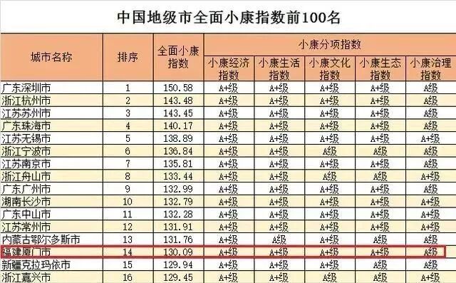 在2018中國(guó)地級(jí)市全面小康指數(shù)前100名(含副省級(jí)城市)中,深圳、杭州、蘇州位列前三位,福建省共有7個(gè)城市上榜,包括廈門(全國(guó)排名第14位)、福州、泉州、龍巖、莆田、三明、漳州。