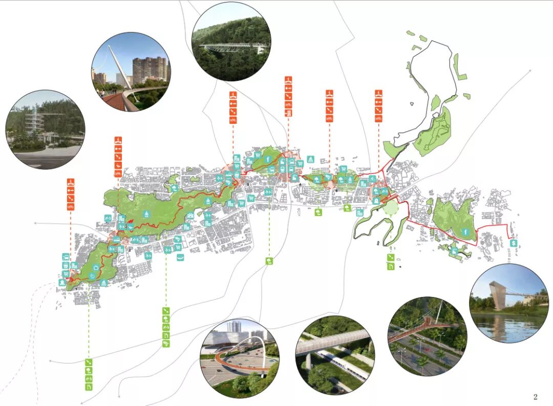 健康步道可分為主線段和節(jié)點(diǎn)橋梁段。主線段總長(zhǎng)約22.2公里,其中新建高架步道10.1公里、新建貼地步道3.2公里、保留現(xiàn)狀地面步道5.3公里、改造現(xiàn)狀步道3.4公里。節(jié)點(diǎn)橋梁(人行)共7座,總長(zhǎng)約1.7公里。