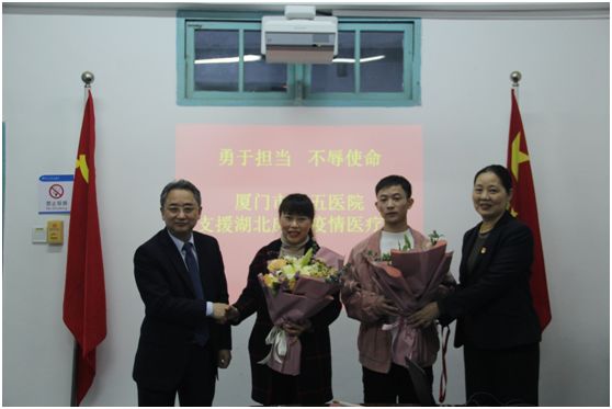 醫(yī)院院長(zhǎng)黃繼義(左一)和黨委書記丁麗遠(yuǎn)(右一)為李秀麗和林豪俊舉行歡送儀式