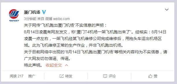 關(guān)于網(wǎng)傳“飛機(jī)跑出廈門機(jī)場(chǎng)”不實(shí)信息的聲明
