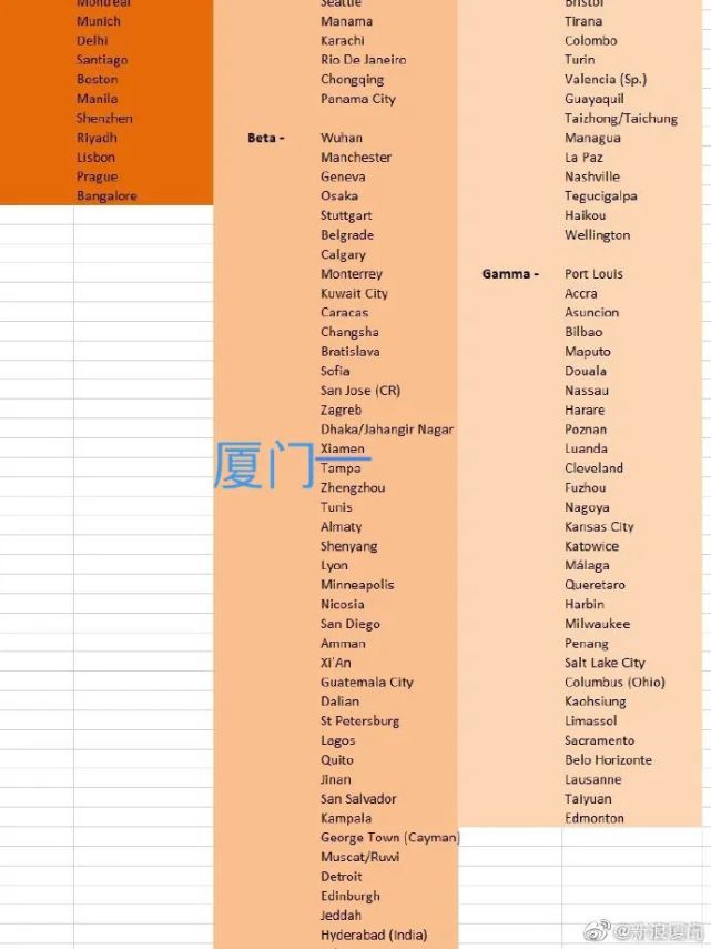 Beta+:成都Beta:天津、南京、重慶、杭州Beta-:武漢、長(zhǎng)沙、廈門、鄭州、沈陽、西安、大連、濟(jì)南