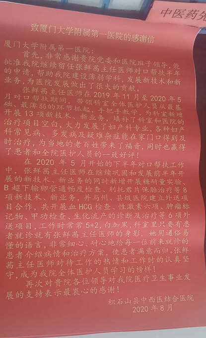 甘肅臨夏積石山縣中西醫(yī)結(jié)合醫(yī)院給廈門大學(xué)附屬第一醫(yī)院的感謝信