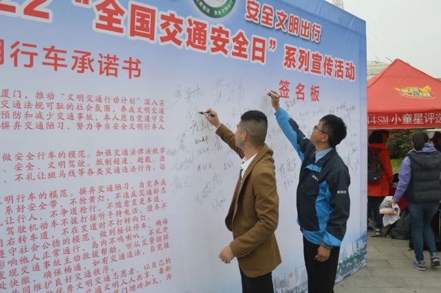 2012年12月2日上午,廈門首個(gè)“全國(guó)交通安全日”宣傳活動(dòng)在國(guó)際會(huì)展中心舉行。當(dāng)天的活動(dòng)高潮迭起,近600名與會(huì)市民穿著不同顏色的服裝組成的“122”數(shù)字造型成為一大亮點(diǎn);全市861個(gè)2011-2012年度創(chuàng)建文明交通示范單位先進(jìn)集體和爭(zhēng)當(dāng)文明交通先進(jìn)個(gè)人獲得表彰;市領(lǐng)導(dǎo)、有關(guān)部門領(lǐng)導(dǎo)及文明交通形象大使侯斌和劉麗為車友貼上了平安車貼;現(xiàn)場(chǎng)還通過駕駛員代表宣讀《遵守交通信號(hào)、安全文明出行倡議書》、百名新訓(xùn)駕駛?cè)诵摹⒑灻吞O果(送平安)等行動(dòng)表達(dá)了“遵守交通信號(hào),安全文明出行”的決心。