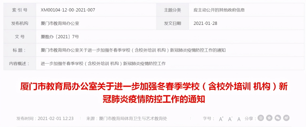 2月1日,市教育局官網(wǎng)公布《關(guān)于進(jìn)一步加強(qiáng)冬春季學(xué)校(含校外培訓(xùn) 機(jī)構(gòu))新冠肺炎疫情防控工作的通知》。