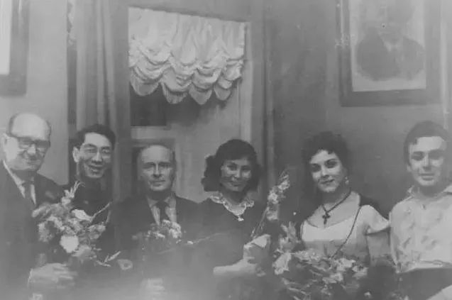 左:1961年,在導(dǎo)師安諾索夫的幫助下,鄭小瑛在克里姆林宮劇院執(zhí)棒了第一場(chǎng)交響音樂會(huì)。右:1962年,鄭小瑛指揮的《托斯卡》成功上演(左起:鄭小瑛的指揮導(dǎo)師安諾索夫、中國(guó)駐蘇使館留學(xué)生參贊張雄飛、鄭小瑛的歌劇指揮導(dǎo)師巴因、鄭小瑛、“托斯卡”“馬里奧”)