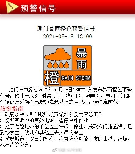廈門市氣象臺2021年05月18日13時00分發(fā)布暴雨橙色預(yù)警信號:預(yù)計未來3小時集美區(qū)、海滄區(qū)、湖里區(qū)、思明區(qū)的部分鎮(zhèn)街及近海將出現(xiàn)50毫米以上的強(qiáng)降水。