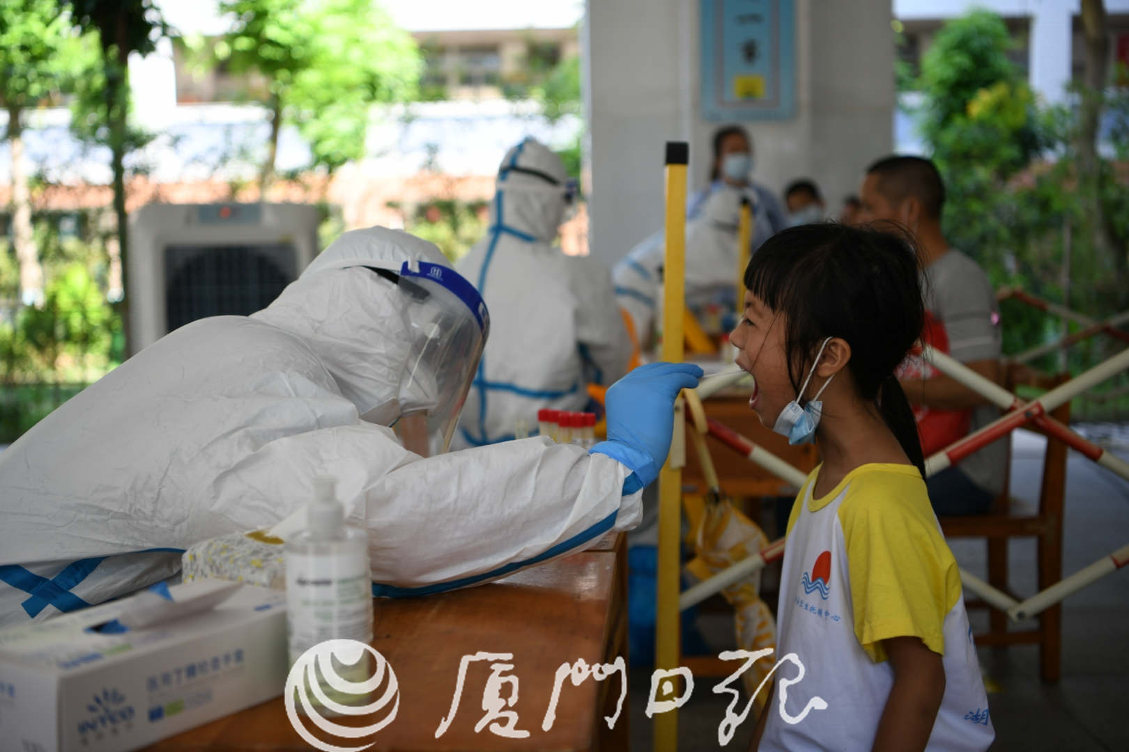 “迷彩服”和“孔雀藍”來了——前天,陸軍第73集團軍醫(yī)院派出47名醫(yī)務(wù)人員,到廈門實驗小學(xué)、思明二實小和廈門一中海滄校區(qū),入校為近6000名師生員工檢測,均采用咽拭子。
