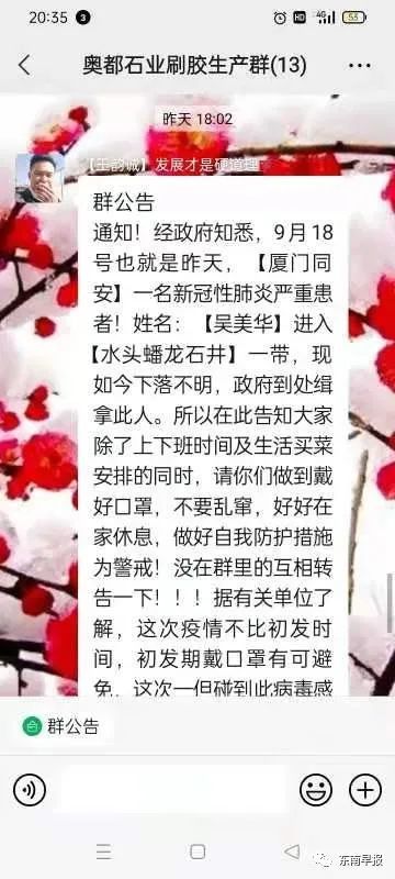 經(jīng)查,9月19日18時(shí)許,水頭鎮(zhèn)蟠龍龍風(fēng)村某工廠上班一男子王某聰在自己的工人微信群里發(fā)送了一條涉疫的虛假信息:“9月18日廈門一名新冠性肺炎嚴(yán)重患者吳美華,進(jìn)入水頭蟠龍石井一帶,現(xiàn)如今下落不明,政府到處緝拿此人。這次的疫情不比初發(fā)期,一旦碰到此病毒感染,戴口罩都有可能傳染至身!”隨后,這條不實(shí)信息在多個(gè)400至500人的微信大群傳播,并且引起了較多討論。