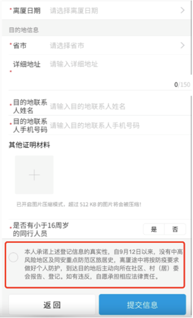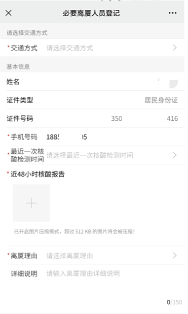 2-1、通過(guò)火車、飛機(jī)、自駕等方式必要離廈人員,如實(shí)填寫(xiě)相關(guān)信息,簽訂必要離廈人員承諾書(shū)。