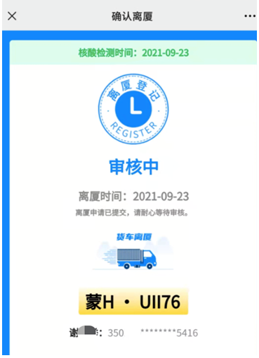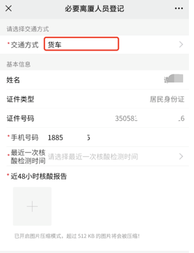 2-2 、符合條件的貨運車輛司乘人員務必在交通方式一欄選擇“貨車”(如選擇其他交通方式,將不能獲得貨車離廈登記碼,貨車無法通行),除填寫2-1內(nèi)容外,還須由所屬或關(guān)聯(lián)的本市企業(yè)提供承諾書。