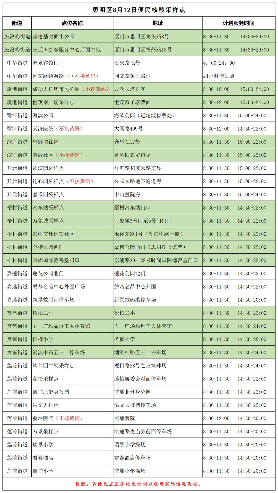 8月12日,湖里區(qū)設(shè)置49個便民采樣點(11個采樣點設(shè)置黃碼通道,5個采樣點設(shè)置24小時服務(wù)),重點行業(yè)、重點人群要嚴格按規(guī)定頻次落實核酸檢測,做到“應(yīng)檢盡檢、愿檢盡檢、早檢快檢”!免費檢測服務(wù)期限延長,結(jié)束時間另行通知。