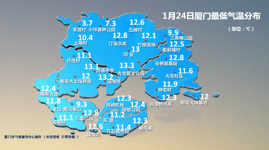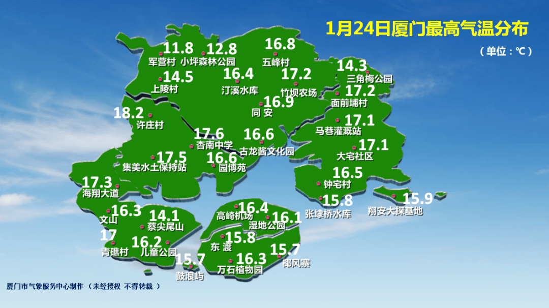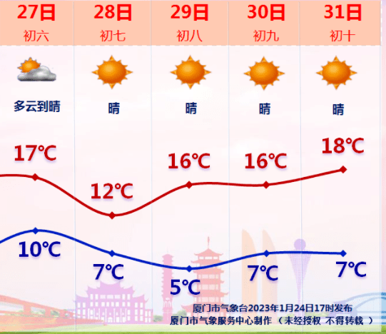 廈門地區(qū)天氣:晴轉(zhuǎn)多云,東北風(fēng)4~5級、陣風(fēng)7級逐漸減弱到2~3級,氣溫:6~16℃;