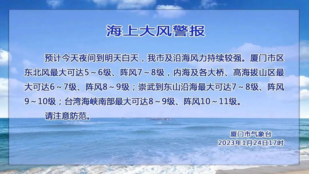 沿海大風(fēng)警報:崇武到東山沿海海面:東北風(fēng)7~8級、陣風(fēng)9~10級減弱到6~7級、陣風(fēng)8~9級;