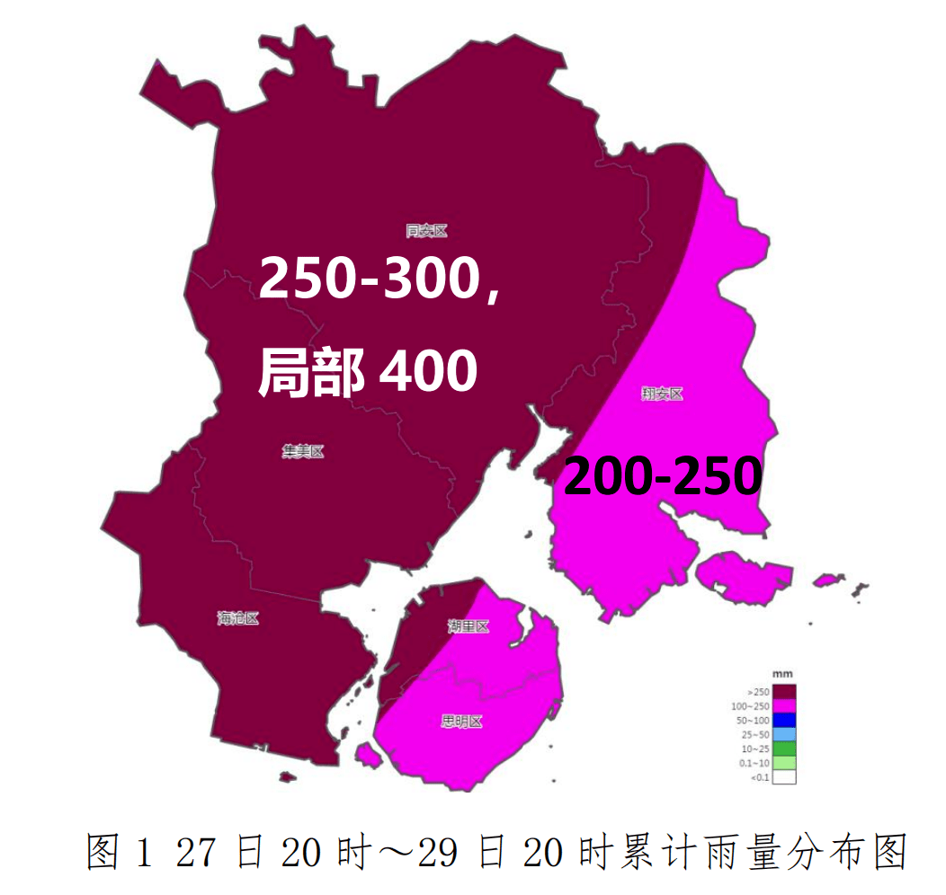 27日夜里起降水逐漸增強(qiáng),預(yù)計(jì)27日夜里~29日我市有大暴雨到特大暴雨過程,主要降水時(shí)段為27日夜間到 28 日夜間。預(yù)計(jì)過程累計(jì)雨量可達(dá)200~300 毫米,局部超400毫米。小時(shí)雨強(qiáng)最大可達(dá)120毫米。降水時(shí)伴有短時(shí)強(qiáng)降水、雷雨大風(fēng)等強(qiáng)對(duì)流性天氣。