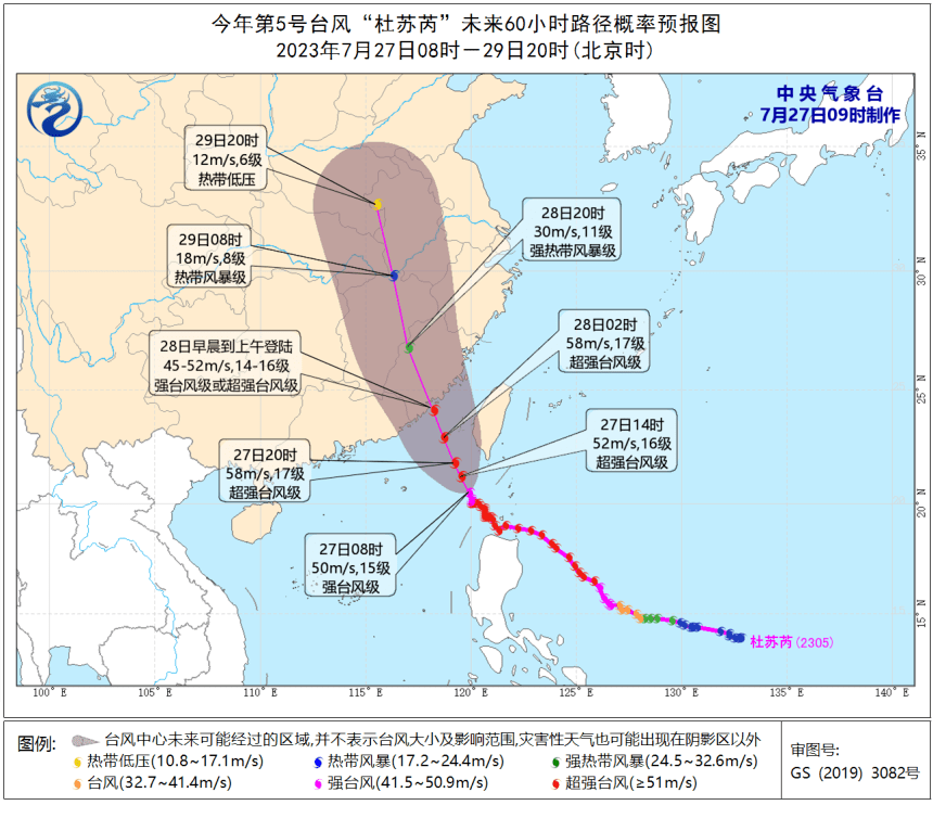 預(yù)計(jì),“杜蘇芮”將以每小時(shí)15公里左右的速度向北偏西方向移動(dòng),逐漸向福建南部沿??拷⒊尸F(xiàn)近海加強(qiáng)特點(diǎn),可能于28日早晨到上午在晉江到漳浦沿海登陸,登陸強(qiáng)度為強(qiáng)臺(tái)風(fēng)級(jí)或超強(qiáng)臺(tái)風(fēng)級(jí)(45~52 米/秒)。