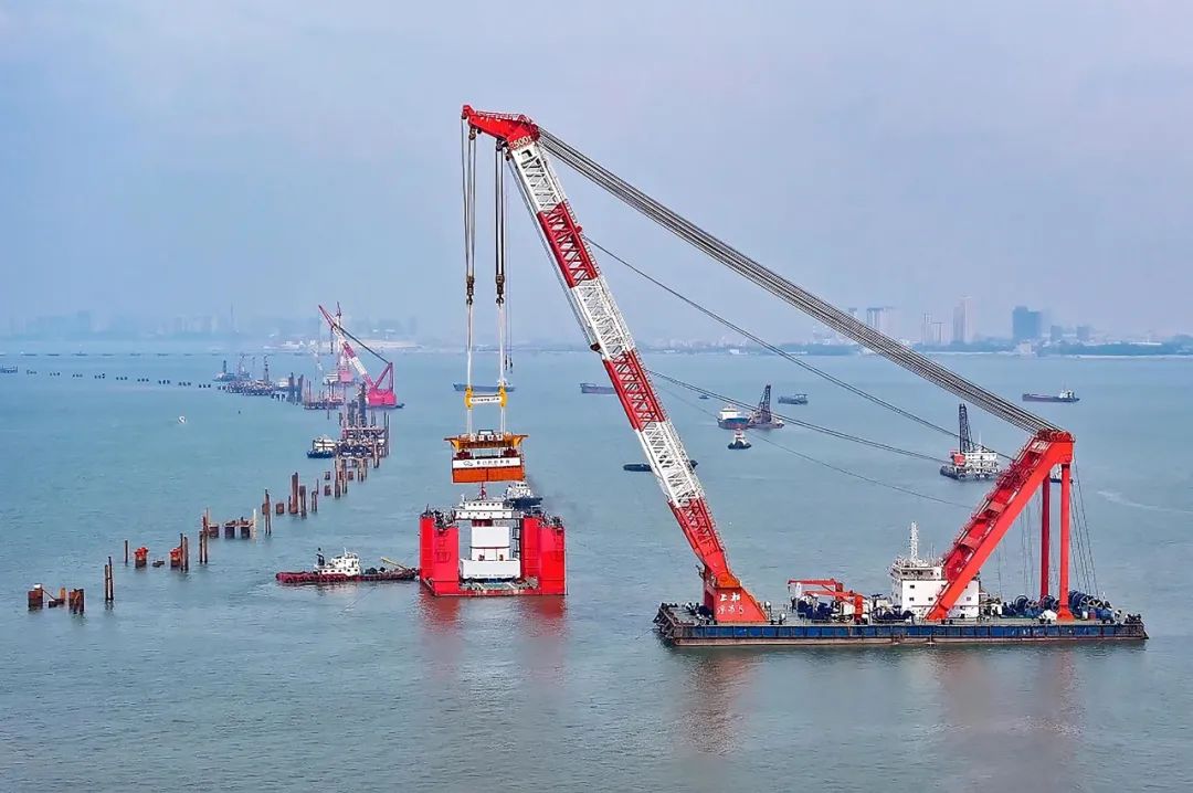 在廈門翔安金門灣海域施工現(xiàn)場,隨著2500噸浮吊主鉤精準(zhǔn)下放,首個(gè)預(yù)制墩蓋梁完成精準(zhǔn)對位安裝。此次安裝的是廈金大橋(廈門段)A3標(biāo)93號墩蓋梁,也是全線安裝的首個(gè)預(yù)制墩蓋梁,長21.6米,寬4米,高6.5米,重約1107噸,其施工難度大。