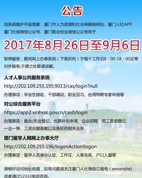 因改版升級需臨時下線,與之相關(guān)聯(lián)的網(wǎng)上辦事大廳、微信公眾號和手機APP的有關(guān)服務(wù)也相應(yīng)暫停使用,網(wǎng)站臨時下線起止時間為2017年8月25日至2017年9月6日。