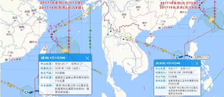 ▲今天(9月13日)凌晨,今年第18號臺風“泰利”和第19號臺風“杜蘇芮”已經(jīng)進入我國臺風24小時警戒圈。