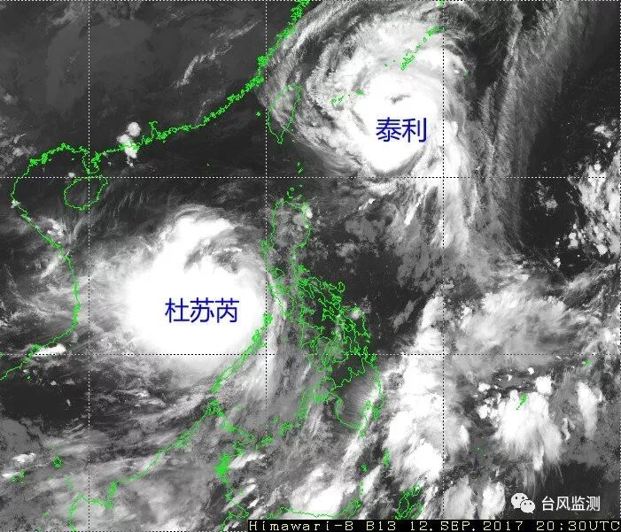 ▲葵花-8號衛(wèi)星9月13日凌晨4時30分監(jiān)測到的18號臺風“泰利”和19號臺風“杜蘇芮”:“泰利”的外圍云系已開始影響浙閩沿海地區(qū),“杜蘇芮”基本擺脫菲律賓地形影響,西側(cè)和南側(cè)對流爆發(fā)顯著,強度將迅速增強。