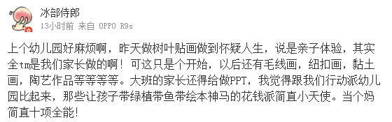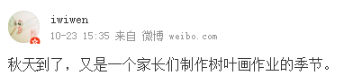 @絳月hope:保安大叔微笑地說:“每到秋天,滿小區(qū)都是這些給娃弄樹葉的家長,哎?你大下雨天跑這干嗎?”我尷尬地舉起手中的袋子:“喏,我就是你口中的家長。”冒雨撿了一堆樹葉,剛進(jìn)家門,阿姨大叫:“我剛打掃完,你又弄一堆垃圾回來。”哎呀,家長真難做,不說了,拼樹葉畫去了。